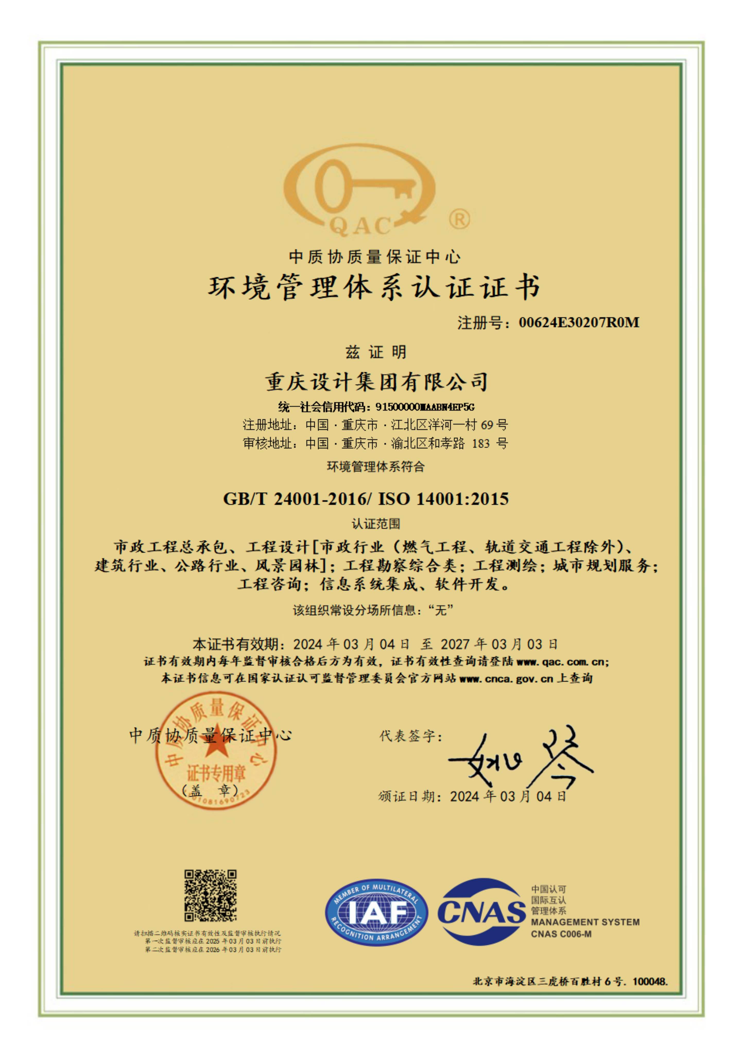 环境管理体系认证证书