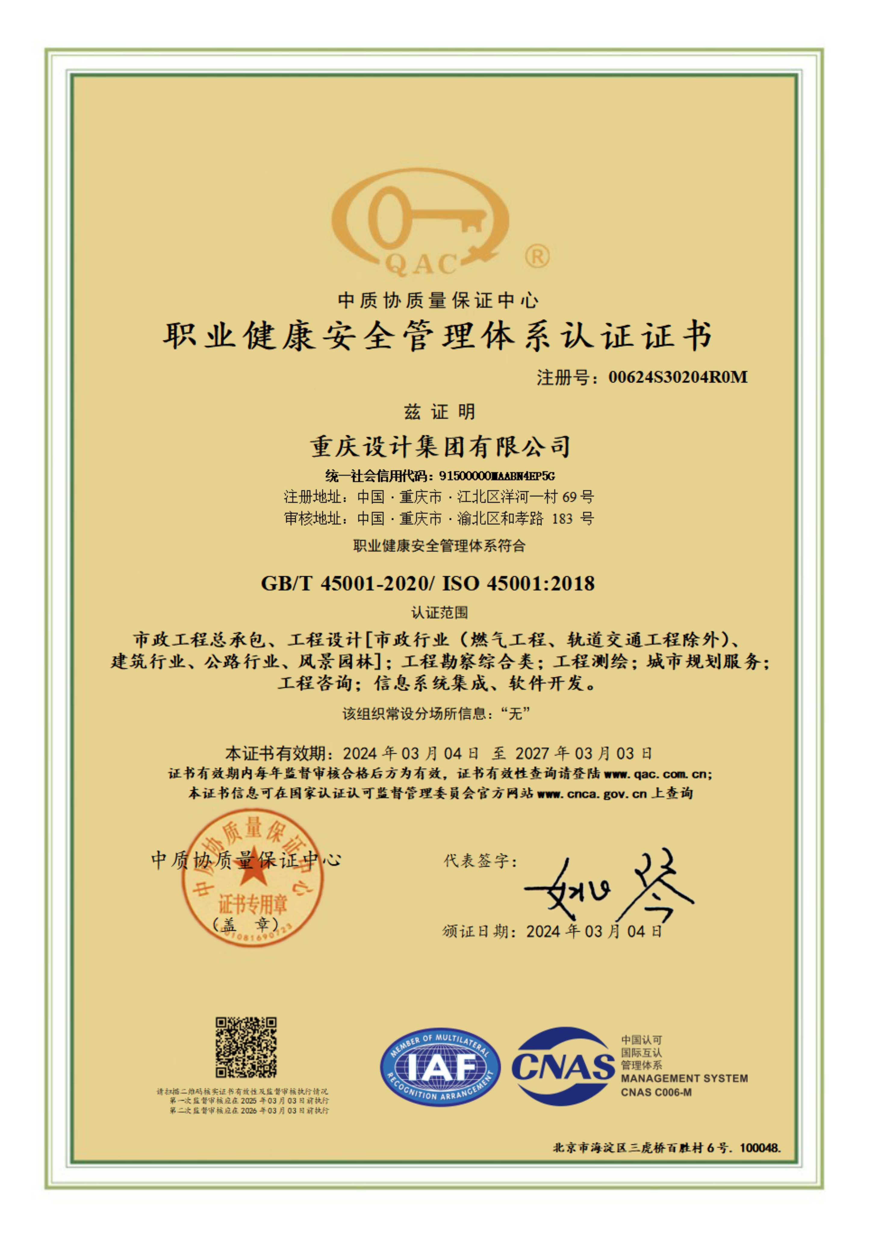 职业健康安全管理体系认证证书