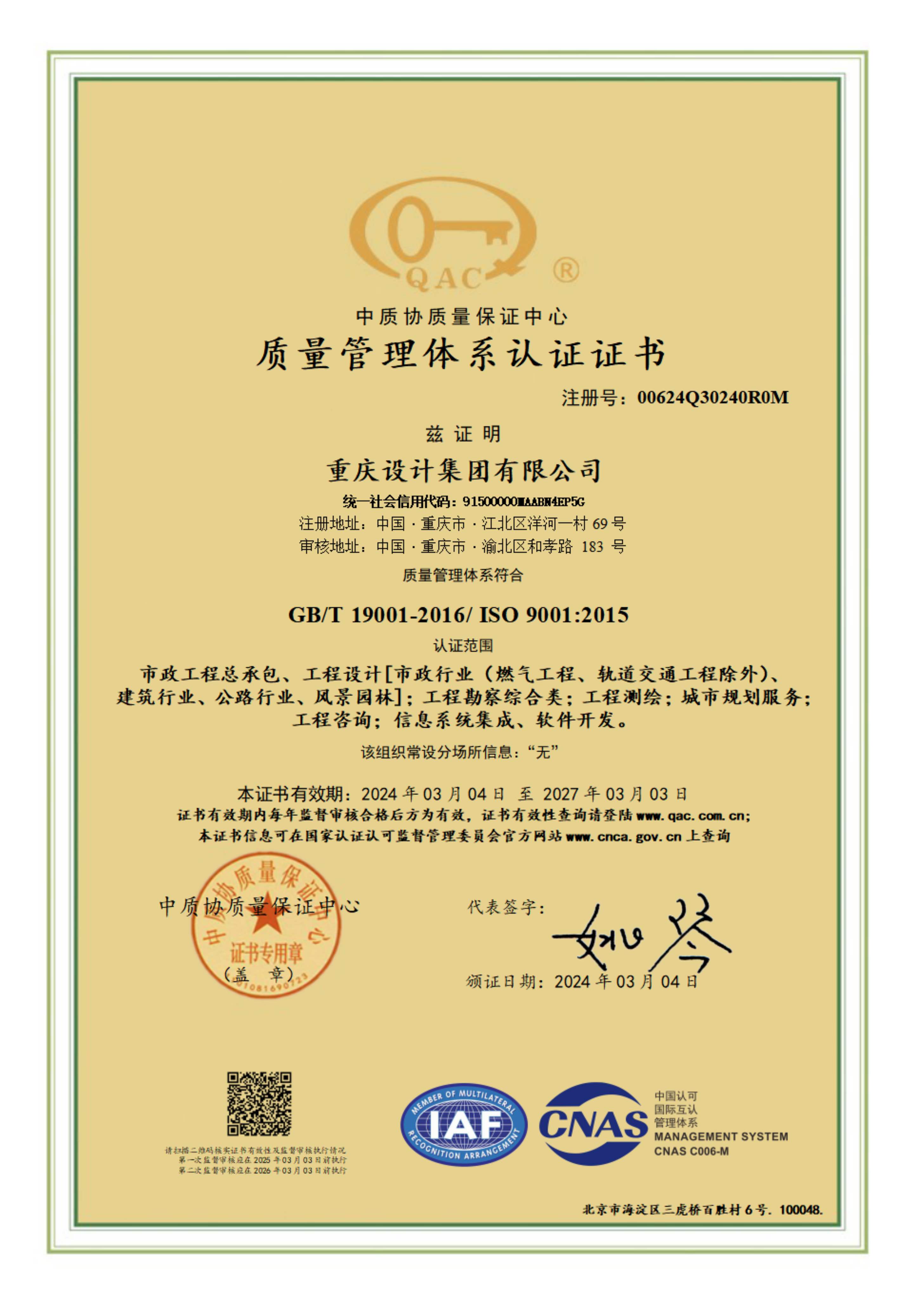 质量管理体系认证证书
